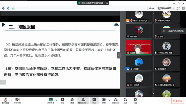 随后,学院党委副书记、院长关明教授对各支部书记汇报的总体情况进行了点评。他提出通过述职考核报告,大家晾出成绩、查找问题、分析原因,起到了“四两拨千斤”作用,推动了全面从严治党向基层延伸、向纵深发展。同时提出了几点要求:一是各支部要建立点评问题整改清单。对点评问题深刻反思、举一反三,将任务明确到人头,实行挂牌式督办,一个问题一个问题地跟进解决。二是解决好党建和业务工作“两张皮”的问题,以高质量党建推动学院高质量发展。三是把落实立德树人根本任务和推进党支部标准化规范化建设结合起来,查短板、强弱项,健全党建工作机制,推动解决突出问题。
