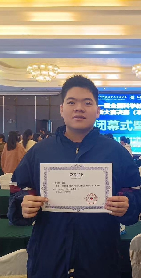 同日,中国青少年科技教育工作者协会举办的第十一届全国科学教育专业师范生教学技能创新大赛决赛在四川省南充市进行。我院化学系大二学生林圣凯同学通过初赛的教学设计、说课视频闯进决赛。在本科和研究生赛道中,通过即席讲演、模拟授课与评委问答三个环节,最终取得国赛三等奖。虽有遗憾,但为我院首次进入此赛事的现场决赛,积累了经验。来年,学院奖提前谋划,加强集训,弥补创新上的短板,力争再创辉煌。林圣凯同学表示:“从9月底确定要参加这次的比赛开始,大二的我对教学设计,教学内容一概不知。一遍又一遍的修改教学设计、做实验、录课。是老师和同学们一次又一次帮助我,让我明确了努力的方向并坚定了信心。在11月中旬收到进入全国决赛的通知,喜出望外,继续筹备现场赛。在董老师的鼓励和指导下,不断的修正自己的讲课。在国赛中拿了三等奖,虽有遗憾,但这一路上奋斗的色彩同样精彩!”