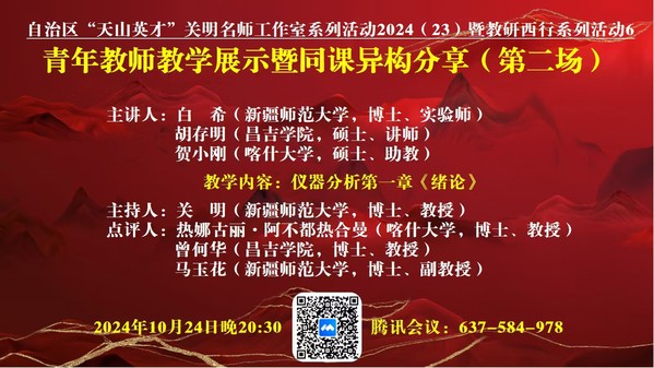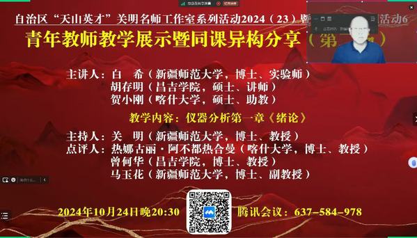 青年教师是教育发展的新生力量,其教学能力和专业素养的提升对于教育教学的改革与发展至关重要。2024年10月24日晚,自治区“天山英才”关明名师工作室、《仪器分析智慧课程》新形态教研西行项目组线上开展了青年教师教学展示暨同课异构分享活动。这一活动不仅有助于促进教师的专业成长,还能增强团队协作精神,推动教育改革与发展,激发教师创新意识。