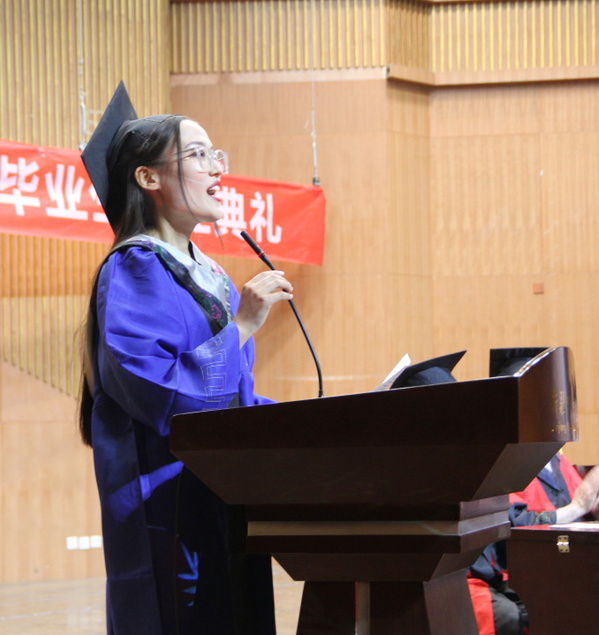 优秀毕业生代表陈致豪、研究生艾迪娅·阿不来提上台发言。毕业班班主任代表20-1班班主任白希发言,导师代表马玉花发言,最后关明校长作毕业寄语。