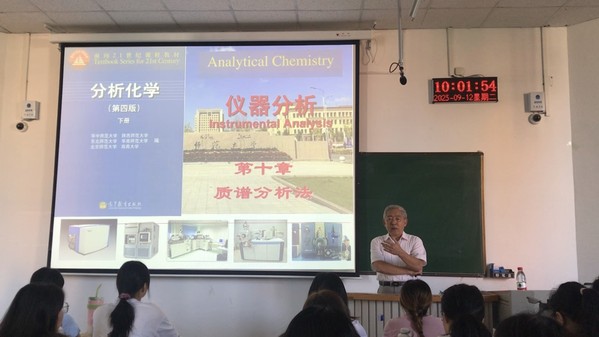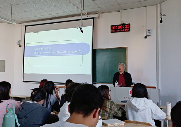 此外,刘虎威教授还来到本科生课堂,为我院化学21-1班、21-2班开展了《仪器分析》课程中的质谱分析、色谱分析法导论部分的授课,为2023级化学专业研究生讲授了高等分析化学中气相色谱、高效液相色谱法的基础理论、应用及前沿发展趋势。刘虎威结合课程内容,对学生提出了发展中国科技,提高中国相关仪器技术水平的期待。刘教授对课程内容深厚宽广的讲授使我院本科生及研究生的眼界大开,受益匪浅,受到了学生的一致好评。
