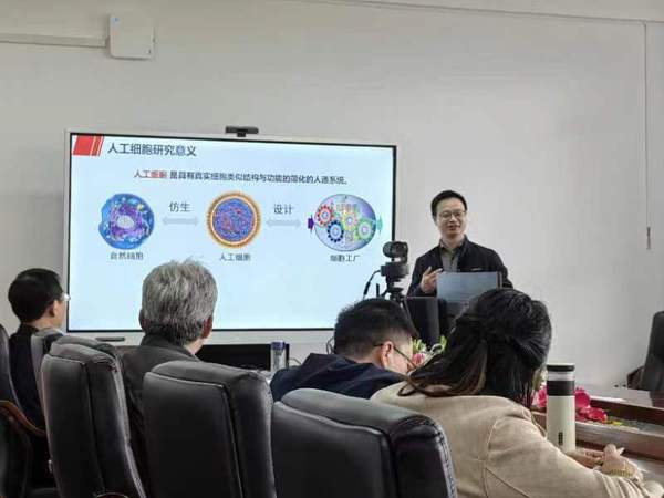 刘剑波教授从基于液液相分离的新型人工细胞腔室构建、基于核酸纳米结构的信号传感体系构建以及能够产生NO的人工细胞在调控生理代谢的应用方面展开介绍,阐述了人工细胞的结构模型、信号感知与级联响应,介绍了近年来团队成员在人工细胞的化学合成以及化学生物分析与生物医学诊疗方面的研究成果。在对研究工作的展望中,刘剑波教授结合湖南省重点发展领域,选择接近民生且具有重大挑战的罕见病作为未来人工细胞领域的研究课题。讲座最后,刘剑波教授向师生介绍了湖南大学的学科建设历程与规划。讲座结束后,学院教师和博士生开展了深入的互动交流,并探讨了开展进一步合作的问题。本次讲座开拓了学院师生的科研视野、为本院科研工作提供了新思路、新方法,将会促进我院科研能力和水平的进一步提升。