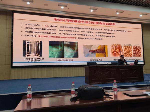 潘浩波研究员结合自身工作,围绕骨科生物材料研发难点:主动干预及精准调控细胞重塑骨稳态展,从“碱性成骨效应”调控成骨与破骨科学观点的发现、双网络生物活性玻璃时序调控细胞功能的开发、如何长效抑制骨肿瘤同步促进良性组织生长、个性化3D打印骨修复体治疗临界骨缺损材料的开发、生物玻璃复合水凝胶促进血管重建引导原位创面组织再生、生物活性玻璃/PMMA骨水泥临床转化、纳米材料递送七个部分内容展开介绍,由浅入深的阐述了碱性微环境调控成骨的发现、碱性开关材料的开发以及骨科植入器械产业化历程,介绍了近年来团队成员在骨科生物医用材料应用领域的研究成果。讲座最后,潘浩波研究员介绍了自己的科研感悟,鼓励师生以兴趣为导向,全身心投入科研工作,把握机遇、战胜自我、不负时代、不负韶华!