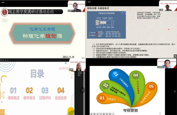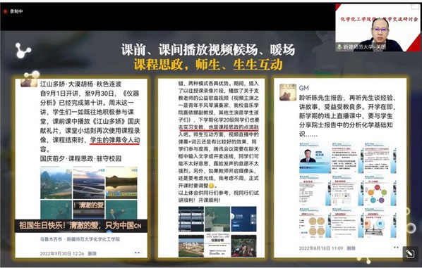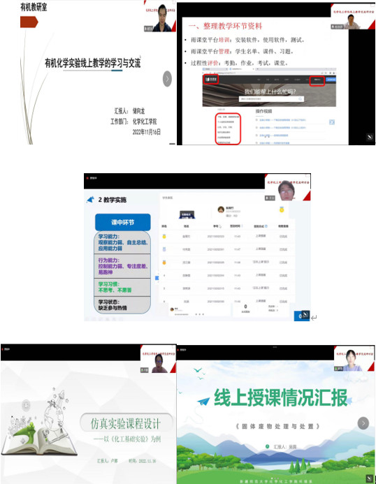 本次会议邀请了西北师范大学的卢小泉教授(博士生导师、国家有突出贡献中青年专家、国务院特殊津贴获得者)作为特邀嘉宾,就如何适应目前的线上教学现状以及如何平衡教学和科研工作进行讨教。随后学院7个教研组的14名老师分别根据自己在线上教学过程中的实际情况,围绕线上教学设计、教学方法、课堂考核评价、学生课堂教学管理等方面展开交流和讨论。其中,分析化学教研组的白希老师和环境教研组的吴畏老师在教学设计过程中将慕课平台、同步课堂、线上教学视频和拓展应考等多种设计手段融入教学过程中,提高了学生的学生兴趣、拓宽了学生的学习思路。有机教研组的储向龙老师和化工教研组的赵志西老师则是通过课前搜集材料设计方案、课中汇报讨论、完成习题和课后互评总结等方式将课堂的主动权交还学生,调动了学生的积极性与参与性,提高了学生的学习效率。这四名老师的汇报课程被推选为樱花直播