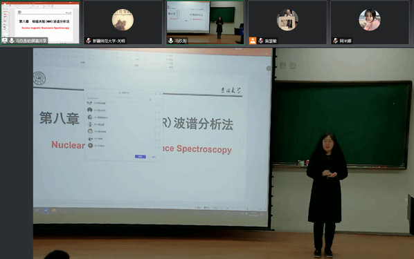 2020级化学专业的83名身在全国各地的学生与吉林大学2021级药学和临床医学专业的学生借助“智慧树”在线同步课堂平台,进行了线上线下课程的同步学习、实时互动。本学期的两次直播授课中,吉林大学马玖彤教授为上好“慕课西行”课程,在与我校仪器分析化学课程团队教师进行深入交流后,根据学情制定授课方案,在授课过程中利用多种信息技术手段,ppt的设计简明美观,嵌入仪器结构动图,抽丝剥茧的讲解解谱方法,让学生在深度参与教学活动的同时,学有所思,学有所获。化学20-4班的李佳文认为:“这种上课方式让人印象深刻,马老师能根据仪器发展历史导入课程,再深入浅出的讲解仪器原理,由易到难,授课时生动形象,激发了我们的学习兴趣。”樱花直播