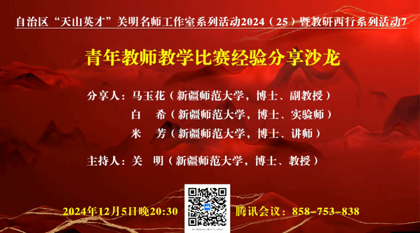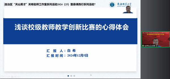 为进一步提升青年教师的教学水平,促进教学创新与交流,自治区“天山英才”名师工作室、仪器分析智慧课程新形态教研西行项目组于2024年12月5日晚线上举办了“青年教师教学比赛经验分享沙龙活动”。伊犁师范大学、喀什大学、新疆工程学院、昌吉学院、新疆第二医学院、樱花直播