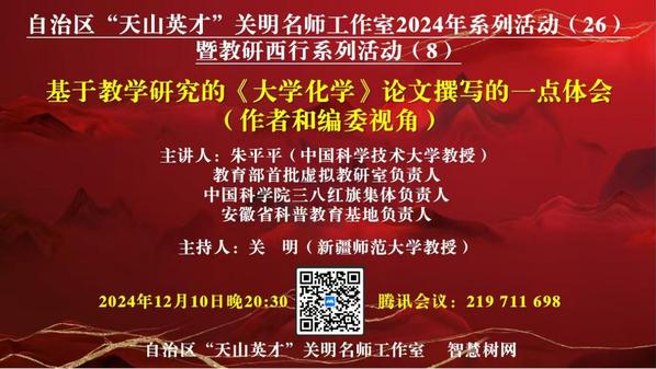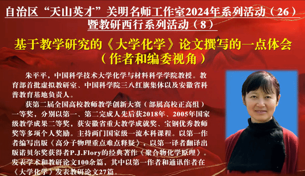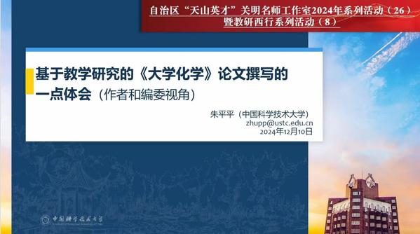 教学研究不仅是教师专业成长的重要引擎,更是推动教育教学质量提升的关键动力。优秀的教研成果通过论文发表、项目申报、研讨会等方式在更大范围内传播,不仅可以促使优质教学资源在高校内部甚至跨校之间共享,而且可以推动教学经验的交流与借鉴,提升高校整体教学质量。为提升教师教学研究能力与教研论文写作水平,助力青年教师专业成长与发展,推动专业成长和教学改革,促进教育教学质量的持续提升,2024 年 12 月10 日晚,自治区“天山英才”名师工作室、仪器分析智慧课程新形态教研西行项目组特邀中国科学技术大学化学与材料科学学院朱平平教授线上作题为“基于教学研究的《大学化学》论文撰写的一点体会(作者和编委视角)”的辅导报告。中国科学技术大学、湖南大学、山西大学、伊犁师范大学、喀什大学、新疆工程学院、昌吉学院、新疆第二医学院、樱花直播