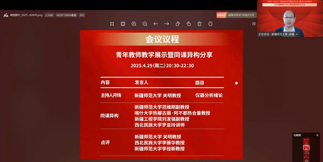 青年教师是教育发展的新生力量,其教学能力和专业素养的提升对于教育教学的改革与发展至关重要。为促进青年教师专业成长,推动教育教学改革创新,2025年4月29日晚,自治区“天山英才”关明名师工作室、《仪器分析智慧课程》新形态教研西行项目组线上开展了“青年教师教学展示暨同课异构分享”活动。本次活动通过多样化的教学展示和深入的研讨交流,为青年教师搭建了展示风采、交流经验的平台。