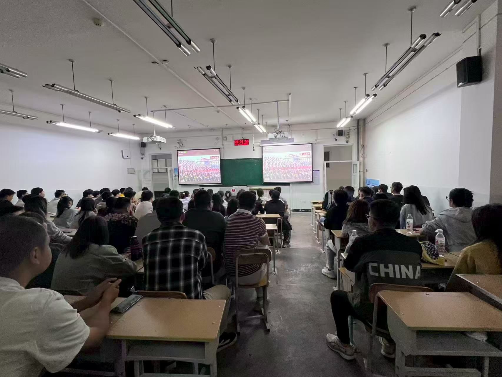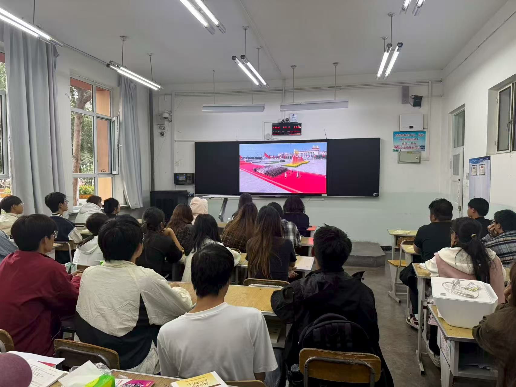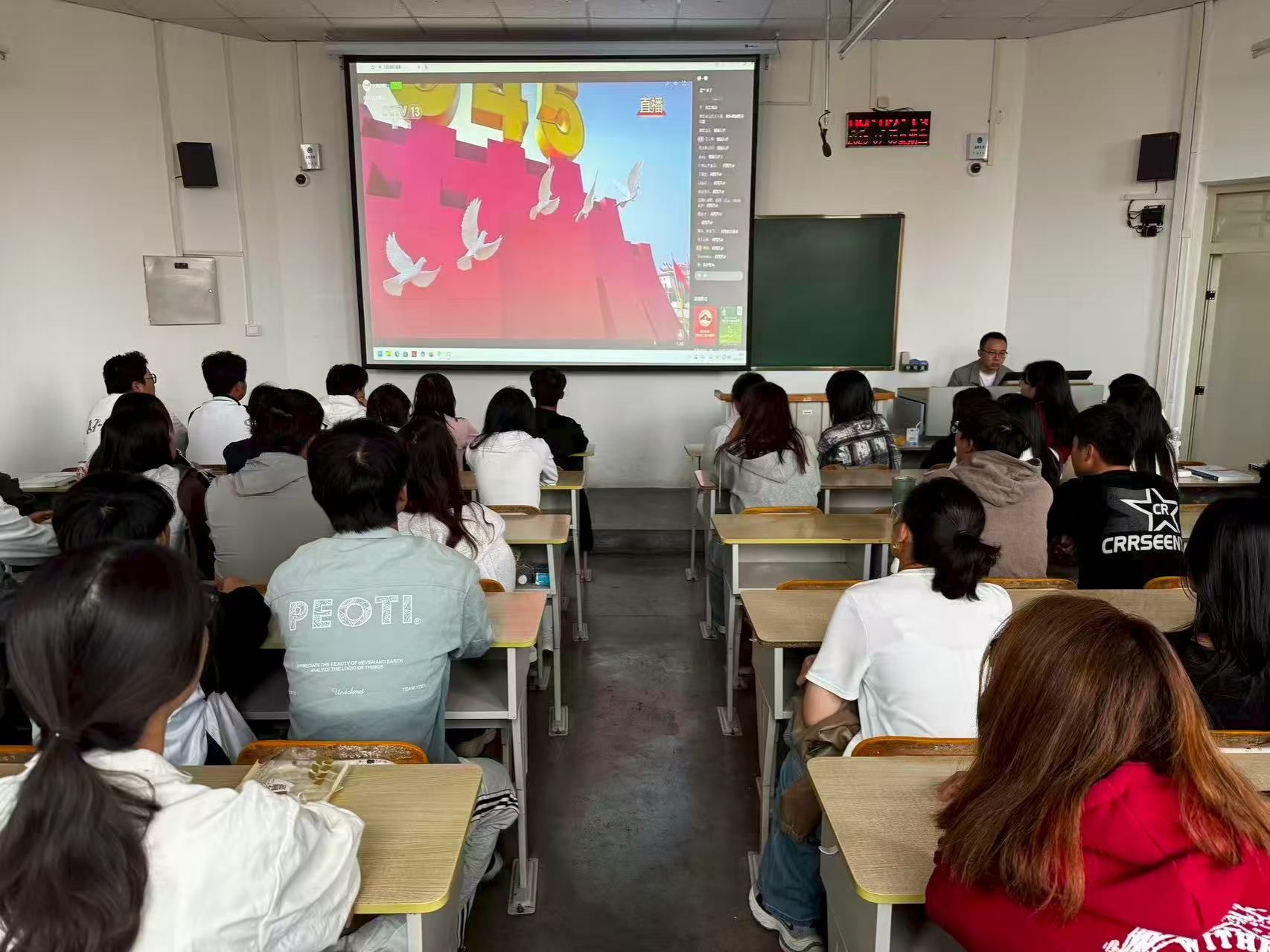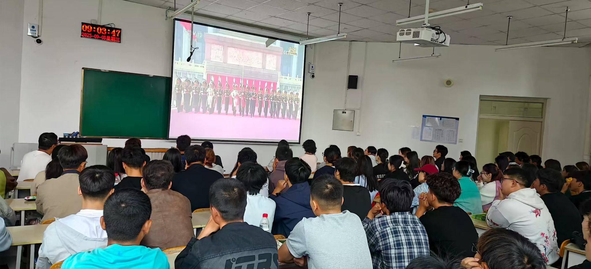 组织学子齐聚教室,通过大屏幕同步观看盛大的阅兵仪式,同学们怀着崇敬与激动的心情,共同见证这一庄严时刻。