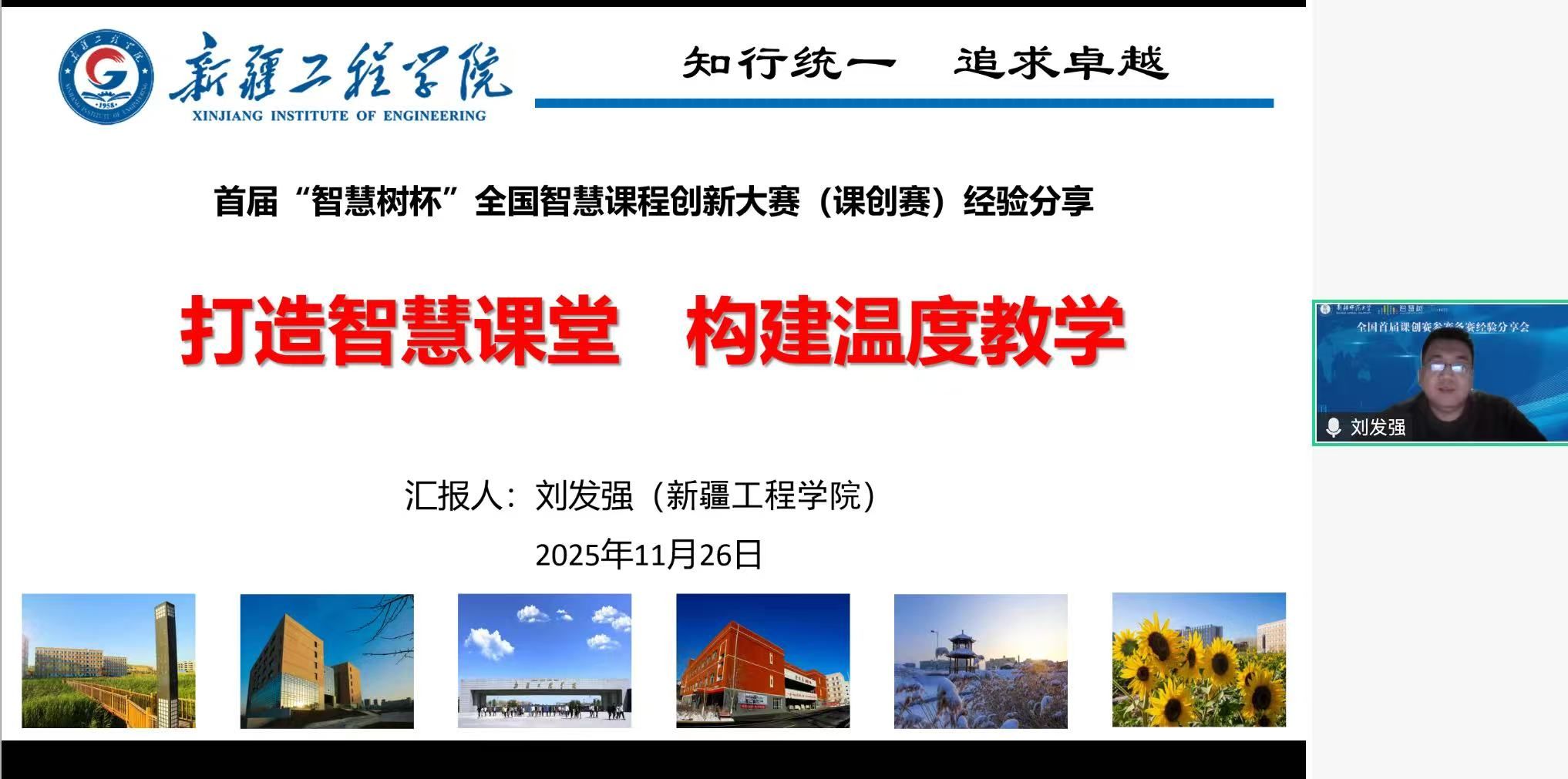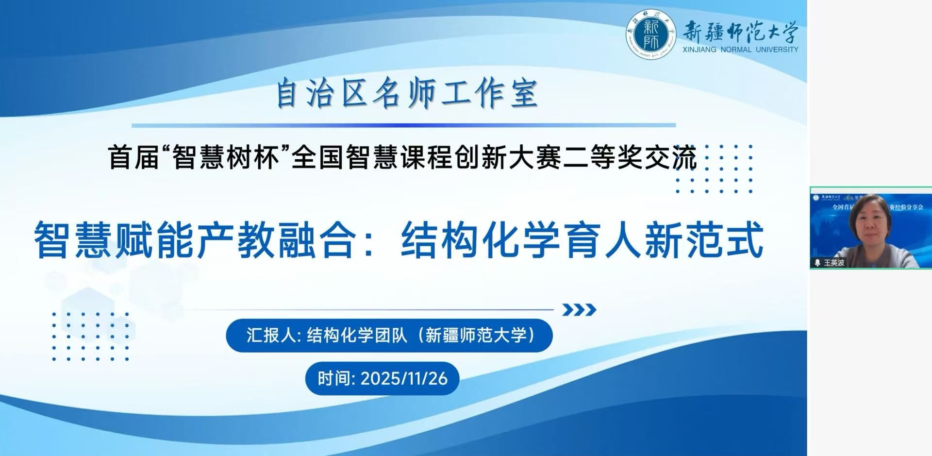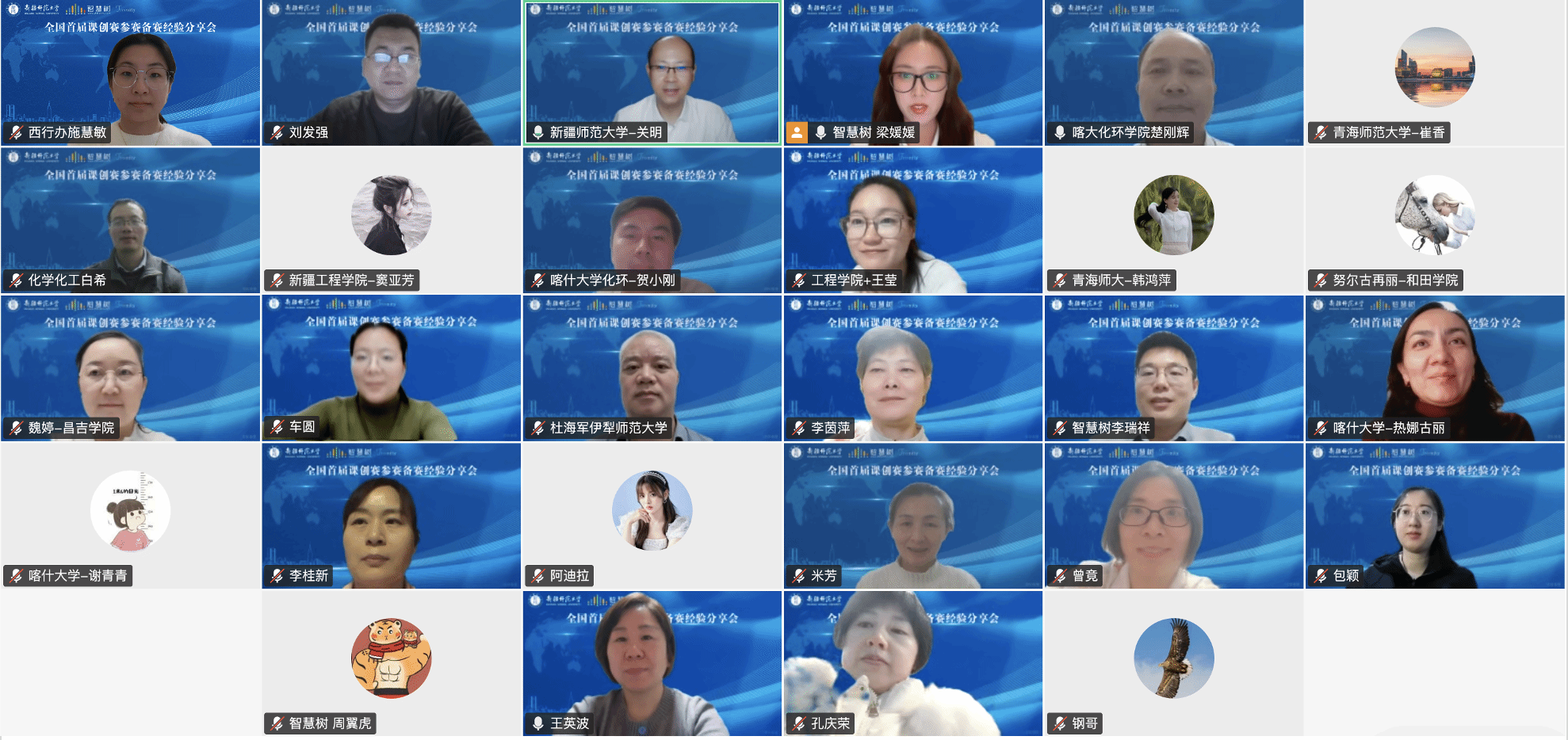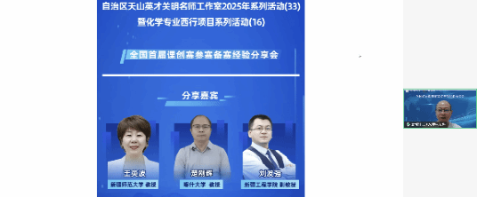 副院长王英波教授、喀什大学化学与环境科学学院副院长楚刚辉教授(自治区天山英才楚刚辉名师工作室、教研西行项目负责人)、新疆工程学院化学与环境工程学院刘发强副教授作专题分享, 三位团队负责人带领青年教师分别斩获首届 “智慧树杯” 全国智慧课程创新大赛二等奖。疆内外多所高校化学学科30余名教师云端参会。