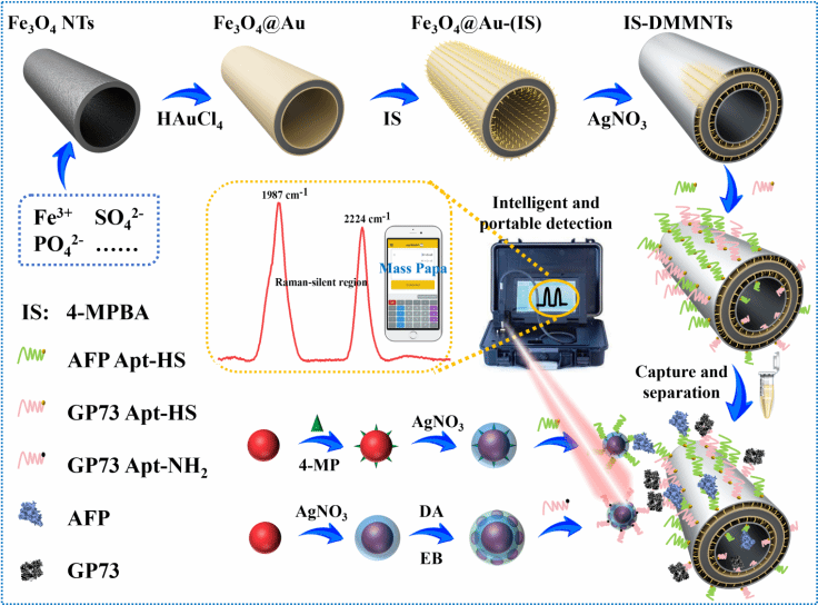 该工作开发了一种基于双增强内标(IS)校准磁性纳米管与正交拉曼标签的智能便携式SERS传感方法,用于肝癌标志物甲胎蛋白(AFP)与高尔基体蛋白73(GP73)的高精度同步检测。创新性地合成涡状Fe3O4纳米管(Fe3O4 NTs),利用其高比表面积及超顺磁性实现低丰度靶标的高效富集与快速分离;并在其表面依次沉积金层、内标分子(4-MPBA)和银层,形成Fe3O4@Au-(IS)@Ag双金属壳结构(IS-DMMNTs)。该设计不仅缓解了贵金属涂层不均匀性问题,提供稳定的电磁增强,更使内标信号与定量信号同步响应环境波动,通过比率分析有效校正系统误差,显著提升SERS定量分析的准确性与重现性。其次,筛选特征峰位于拉曼静默区(1800-2500 cm⁻1)的正交报告分子,分别构建两种高性能SERS标签,避免生物基质背景干扰,实现多靶标无交叉干扰的同时识别。建立的夹心检测系统结合便携式拉曼光谱仪与智能软件,实现了AFP和GP73的快速定量分析,检测限分别低至0.433 pg/mL和0.370 pg/mL,加标血清样本的回收率为95.62%—106.2%。通过简单替换适配体,该方法可以很容易地扩展到其他靶标,显示出极好的通用性。这项工作为早期HCC诊断提供了可靠的分析工具,并为SERS技术在复杂样本中的临床转化奠定了基础。