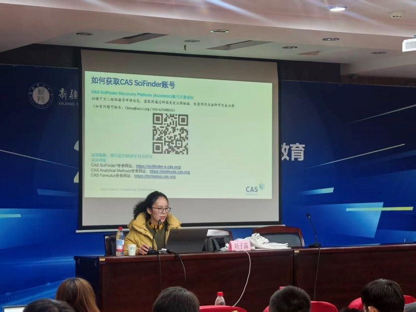 系列学术活动。美国化学文摘社(CAS)解决方案专家刘子露博士应邀为学院师生作了题为《如何利用CAS SciFinder Discovery Platform高效全面获取科技信息》的学术报告。本次报告由阿布都热西提·阿布力克木教授主持,学院教师及研究生积极参加。